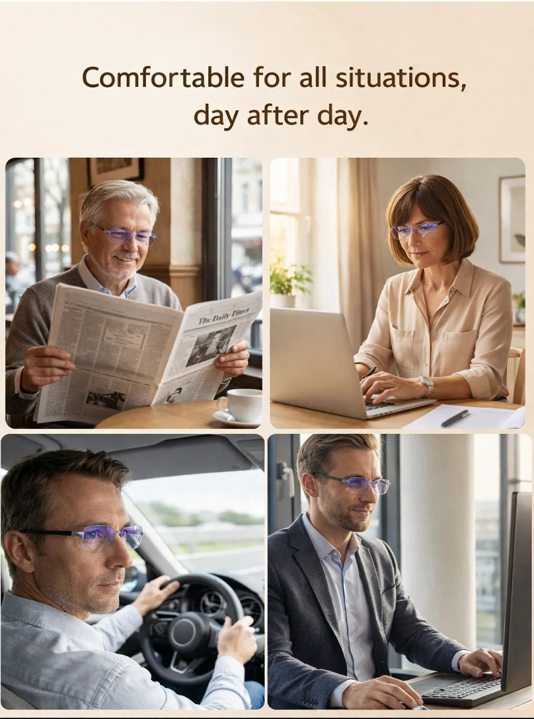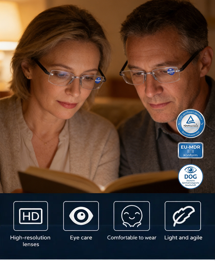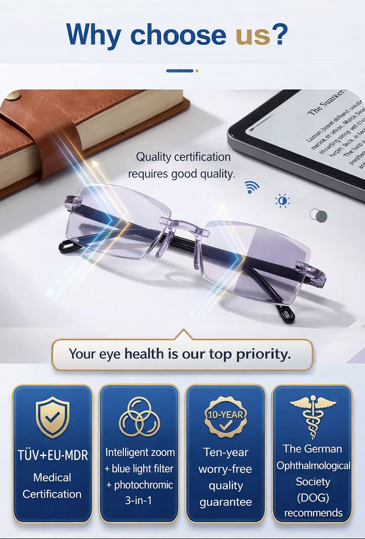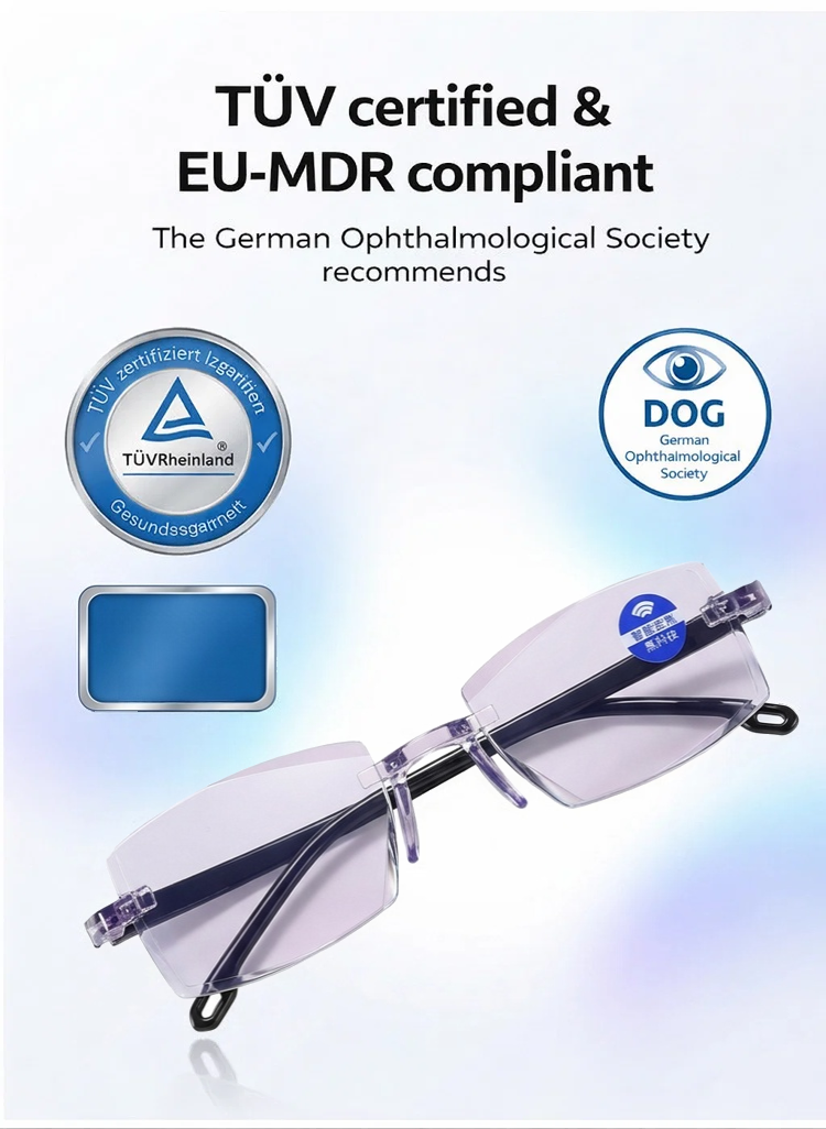🧠🔍 An integrated smart algorithm lets the lenses "think": They gently adjust to every distance. The transition between near and far vision is as smooth as flowing water. One pair of glasses for your entire world. 🛡️💻 High-end blue light protection safeguards your eyes from digital stress. ☁️🕊️ Made from high-tech, lightweight materials used in aviation – so light you'll hardly notice you're wearing them. 🧘♂️🍃 Featuring innovative negative ion technology for relaxed vision, even on long days.