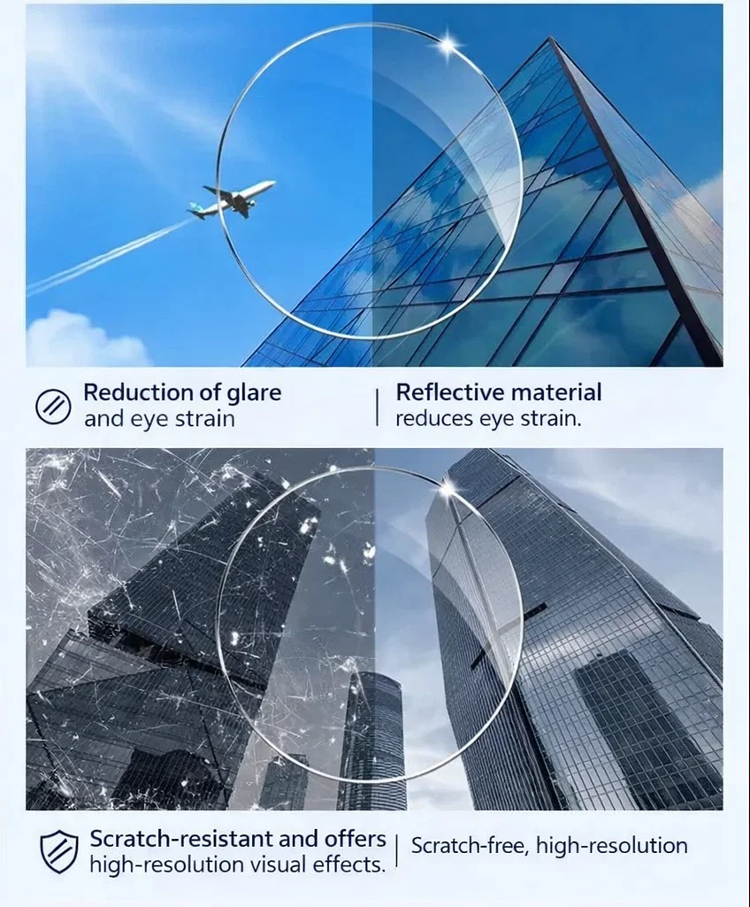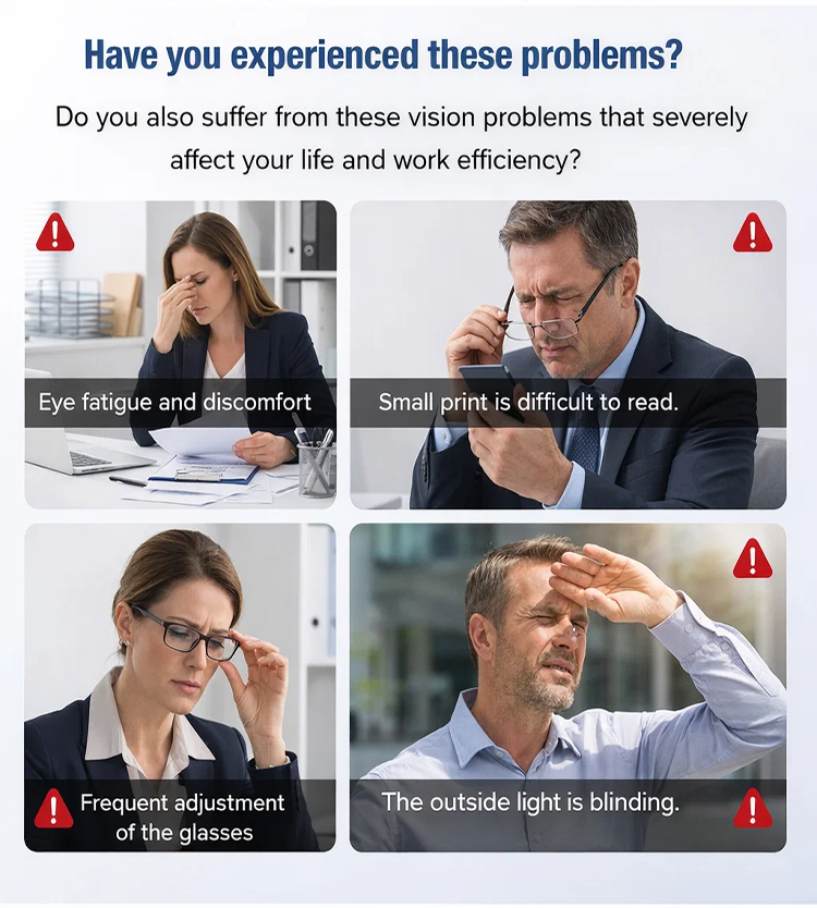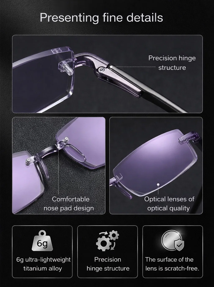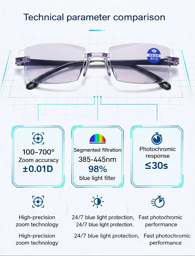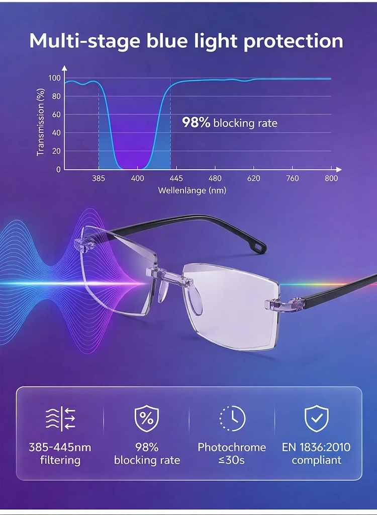 🧠🔍 An integrated smart algorithm lets the lenses "think": They gently adjust to every distance. The transition between near and far vision is as smooth as flowing water. One pair of glasses for your entire world. 🛡️💻 High-end blue light protection safeguards your eyes from digital stress. ☁️🕊️ Made from high-tech, lightweight materials used in aviation – so light you'll hardly notice you're wearing them. 🧘♂️🍃 Featuring innovative negative ion technology for relaxed vision, even on long days.
